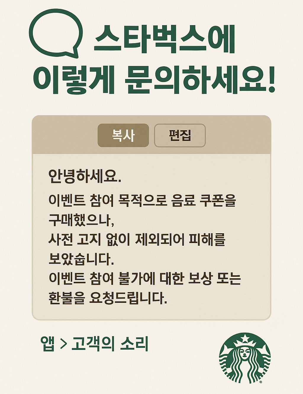 스타벅스 앱의 [고객의 소리]를 통해 이중 요청하면, 브랜드 측에도 부담을 줄 수 있습니다.